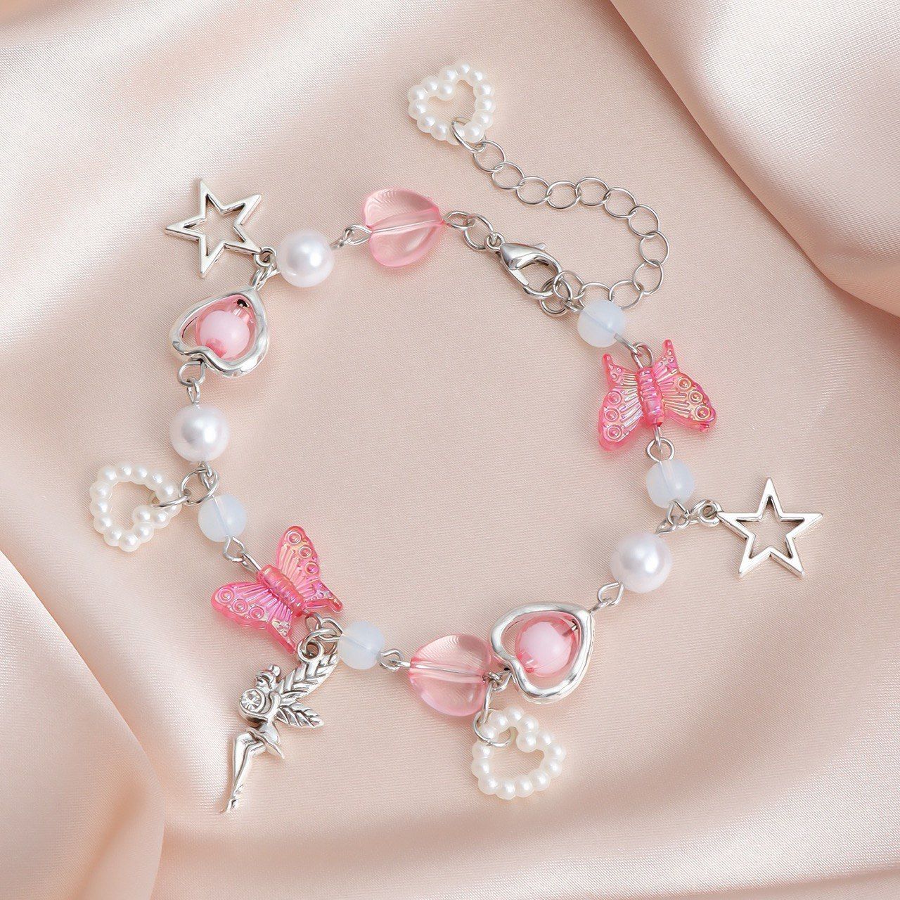 Стильный женский браслет украшен яркими элементами в стиле y2k и сразу привлекает внимание окружающих.Идеальное украшение в стиле корейской моды для девочек подростков. Браслет на руку выполнен из блестящих бусин, украшен вставками в виде бабочек, подвесками сердечки, [...]