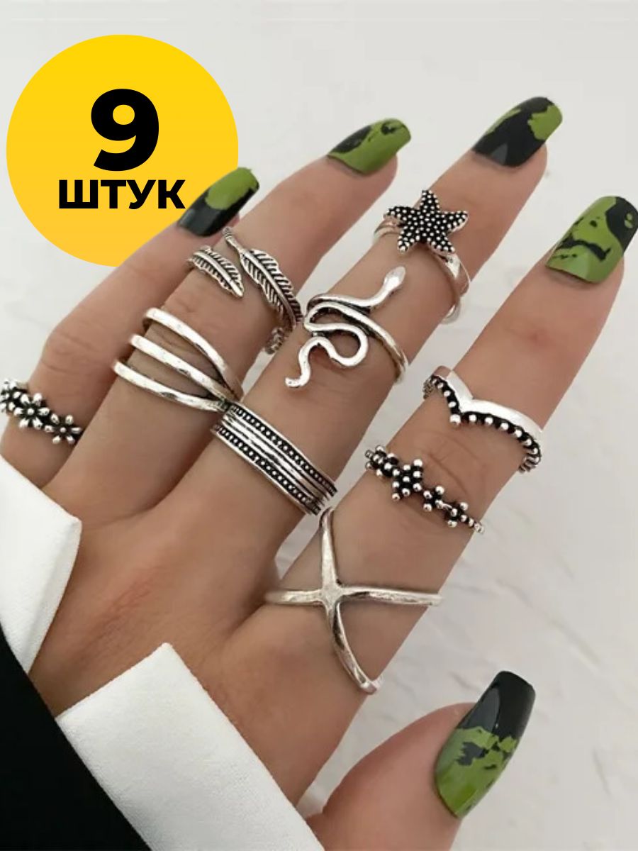 Набор колец 9 штук бижутерия серебристого цвета, Сет колец имитация серебра.Кольца - аксессуары на все случаи жизни. Этот набор можно использовать как в комплекте, так и индивидуально носить каждое кольцо. Набор выполнен в абсолютно разнообразной тематике: змея, цветочный [...]