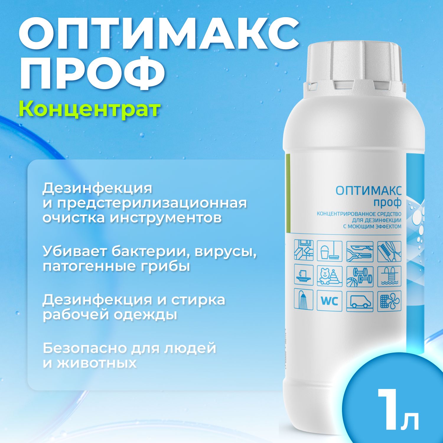 Оптимакс Проф с мерным колпачком универсальное концентрированное дезинфицирующее средство с моющим эффектом для обработки инструментов, 1000 млОсобые свойства: Не вызывает коррозии металлов; Сохранение свойств при замораживании/размораживании; Не обесцвечивает ткани; [...]