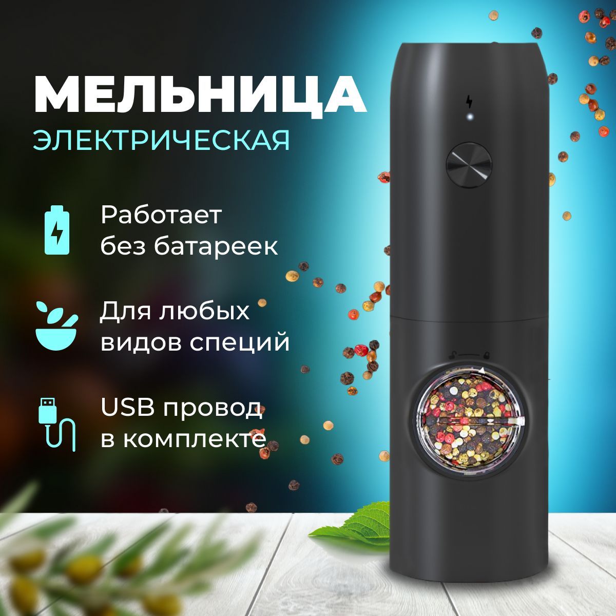 Электрическая мельница измельчает перец-горошек, соль и другие специи. Степень помола регулируется винтом. Устройство имеет конические жернова из керамики, они долговечные, не стираются и не ржавеют. Мельница удобно лежит в руке, включается одной кнопкой и работает от 4 [...]