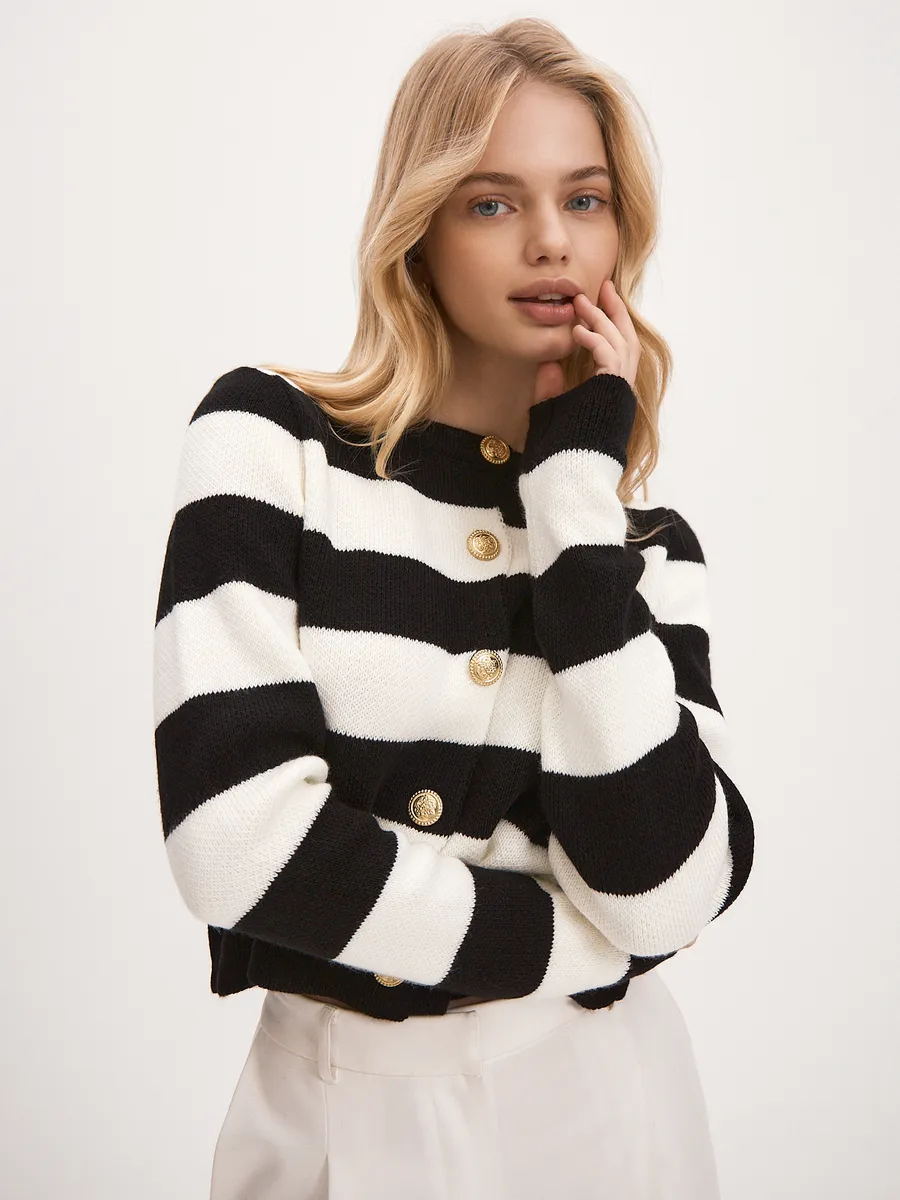 Кардиган женский в полоску на пуговицах в стиле олд мани. Трендовая короткая модель из трикотажа прекрасно вписывается в классический и молодежный стиль, ее непременно оценят любительницы винтажа. Укороченный полосатый кардиган идеально подойдет на весну и осень, [...]