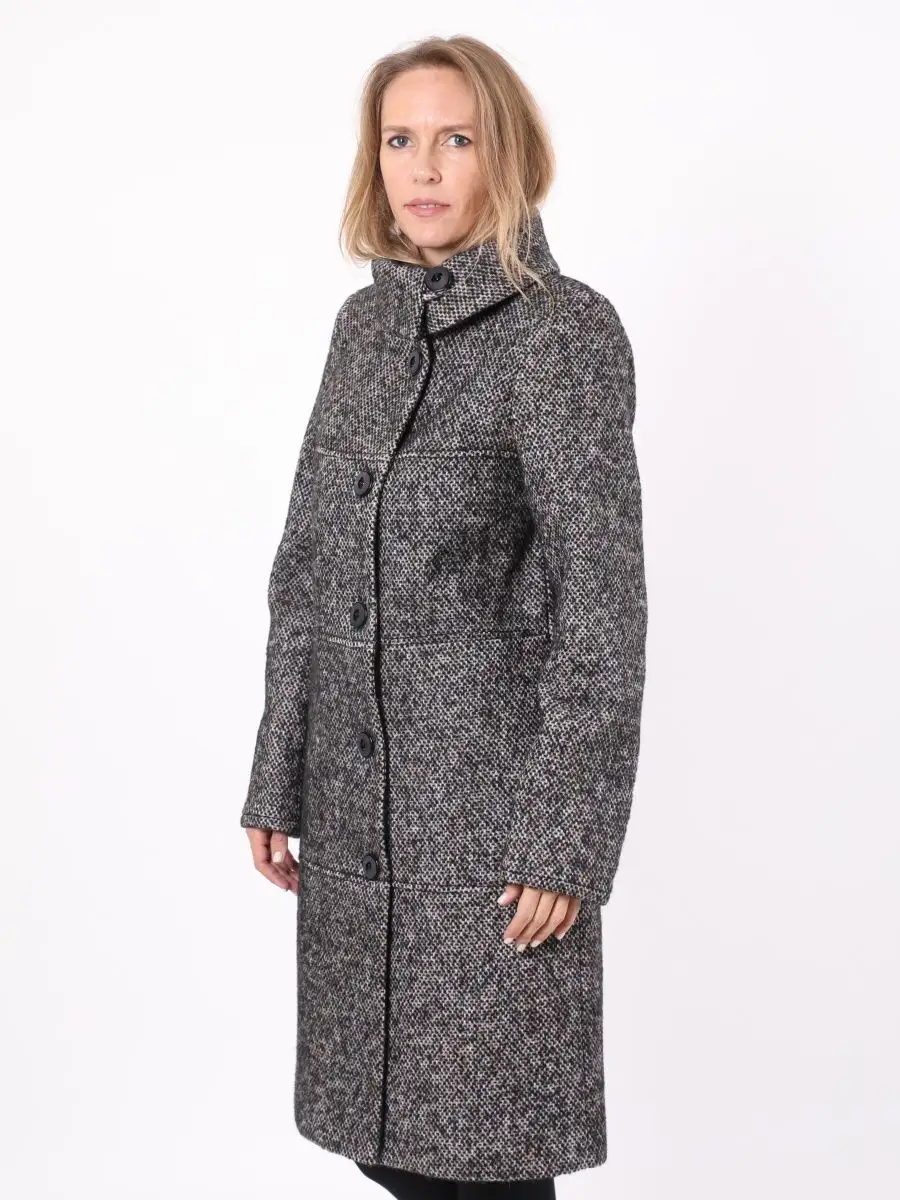 Женское утепленное пальто из твидовой ткани с высоким воротом на запах. Демисезонное пальто застегивается на 2 кнопки и завязывается поясом на талии. Пальто с высоким удобным воротником стойкой, которую можно запахнУть или отложить. Пальто женское на теплую зиму, [...]