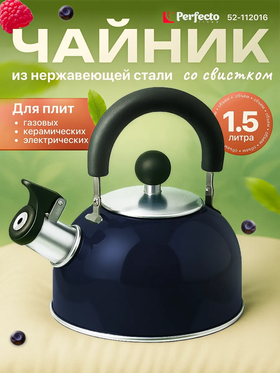 Чайник со свистком для плиты PERFECTO LINEA Holiday 52-112016 синий металлик изготовлен из качественной нержавеющей стали. Не подходит для индукционной плиты! Общий объем посуды 1,5л полезный объем 1,2 литра. Чайник металлический имеет нескользящую удобную ручку, выполненную из бакелита. [...]