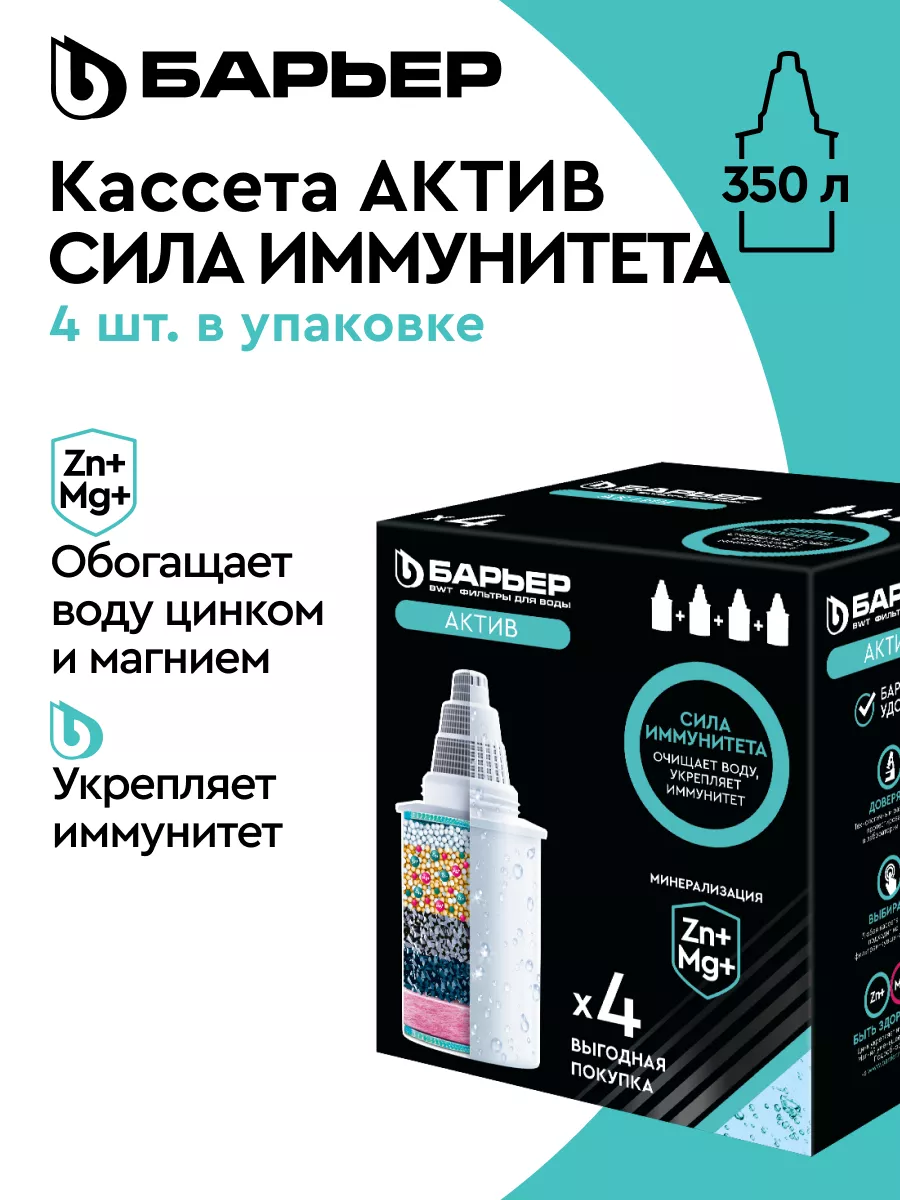 Комплект из 4 сменных кассет для фильтра БАРЬЕР Актив Сила Иммунитета. Обогащает воду важнейшими «строительными элементами» иммунной системы – цинком и магнием. Уменьшает образование накипи, удаляет хлор, тяжелые металлы и другие вредные примеси. Цинк повышает защитные [...]