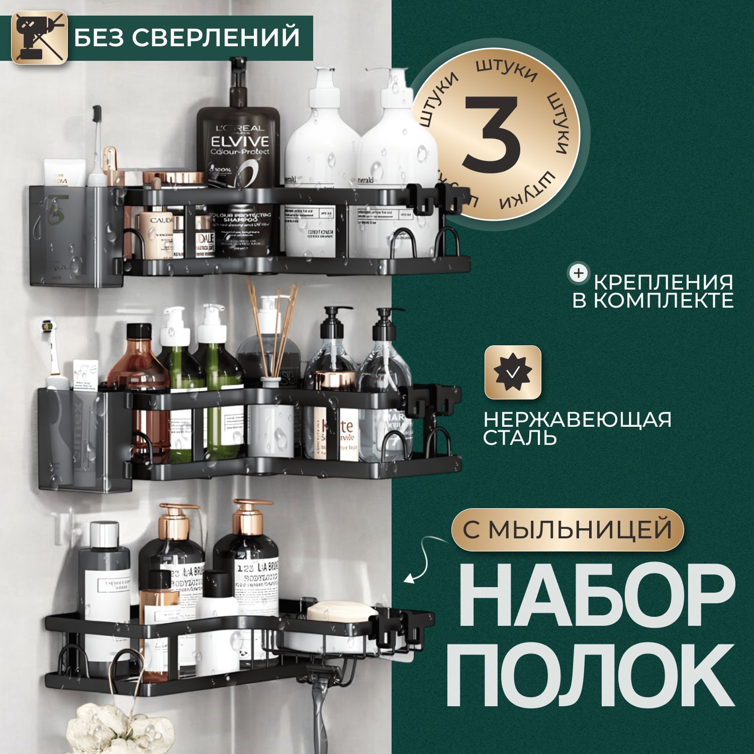 Полка для ванной. Полку в ванную удобно установить без сверления стены. Полки для ванной комнаты серебристые подойдут к любому дизайну. Полка для ванной угловая разместит все ваши принадлежности для душа. Полка для душа металлическая выполнена из нержавеющей стали. [...]