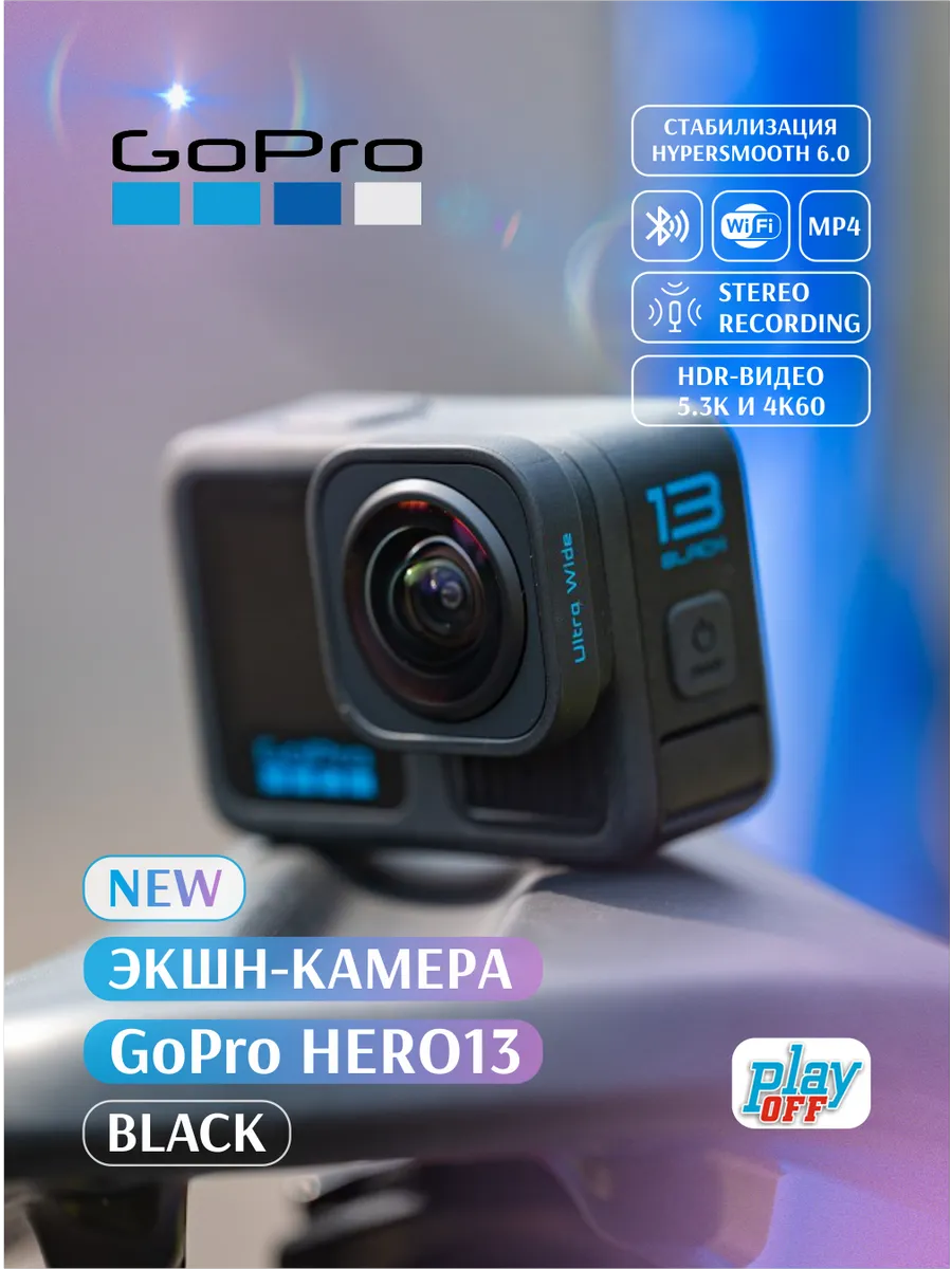 Экшн-камера GoPro Hero13 черный, матрица 1xCMOS 27.6Mpix, поддержка карт Карта microSD не ниже класса V30 или стандарта UHS-3 до 1 Тб, видеозапись 5.3K (8:7)30/25/24 кадра/с (CHDHX-131-LA) Запись звука. Поддержка внешнего дисплея. Сенсорный дисплей. Водонепроницаемый корпус камеры. Циклическая запись видео. [...]