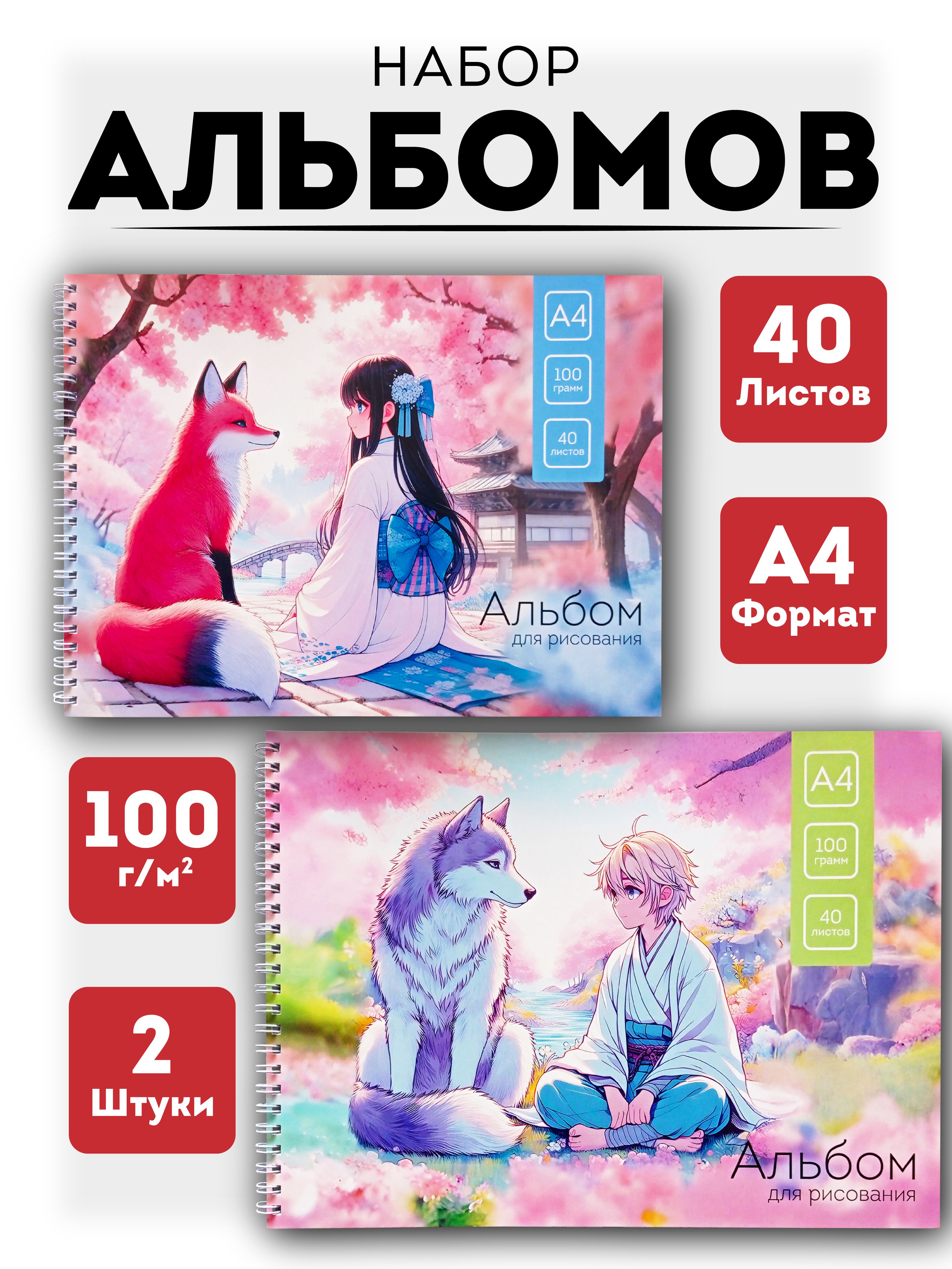 Набор альбомов А 4 из двух штук для рисования для мальчика и девочки. Яркая твердая обложка с героями японской анимации - девушка с лисой и парень с волком - выполнена из мелованного картона, что придает привлекательный вид и радует ребёнка. Комплект канцелярских [...]