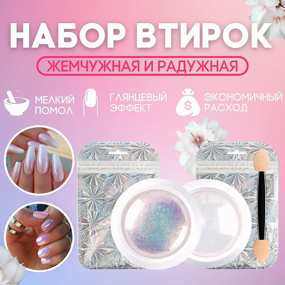 В наборе идут втирка жемчужна и втирка радужная единорог. Втирки имеют мелкую дисперсию что позволяет создать красивый зеркальный эффект мерцания на ногтях. Для удобства нанесения втирки в наборе идёт косметический спонж. [...]