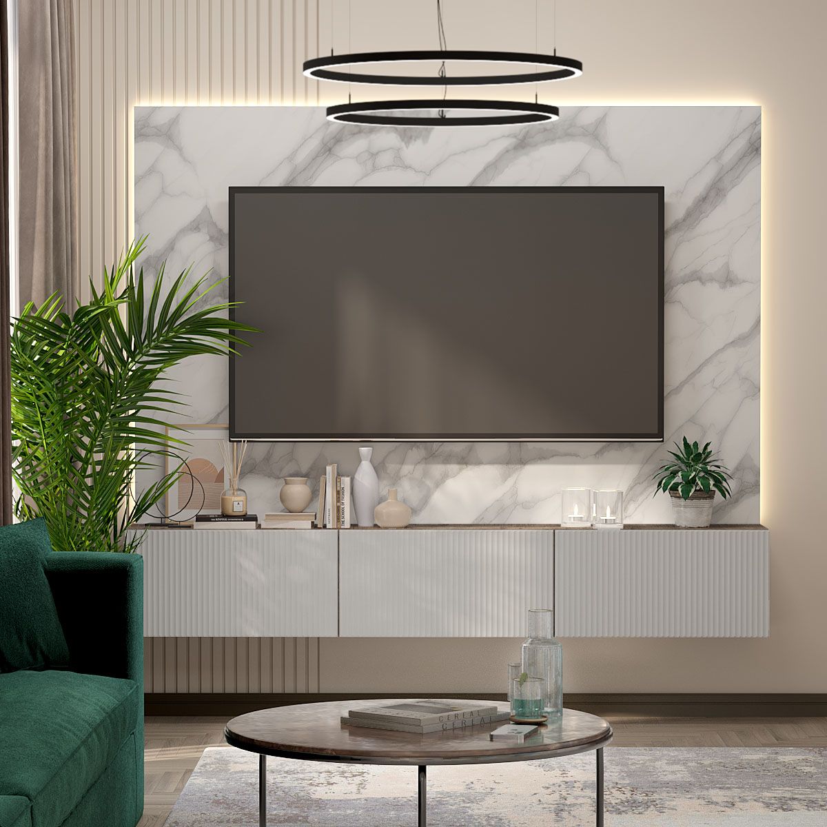 Тумба под телевизор подвесная подойдет для квартиры или дома. Навесная тумба встанет в прихожую, гостиную или спальню. тв тумба 180 см с дверцами длинная подойдет для комнаты: хранения вещей и одежды. Подвесная парящая консоль узкая и длинная, позволяет правильно [...]