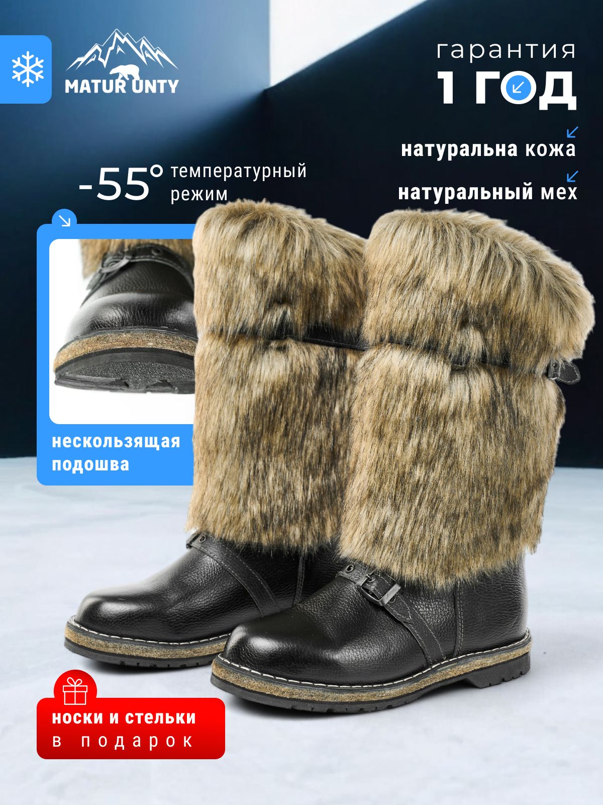 Высокие зимние мужские унты из натуральной кожи и овчины обеспечат непревзойденную теплоизоляцию и защиту от холода. Температурный режим использования до -60 градусов.Натуральная кожа прочная и долговечная, выдерживает суровые зимние условия.Натуральный мех [...]