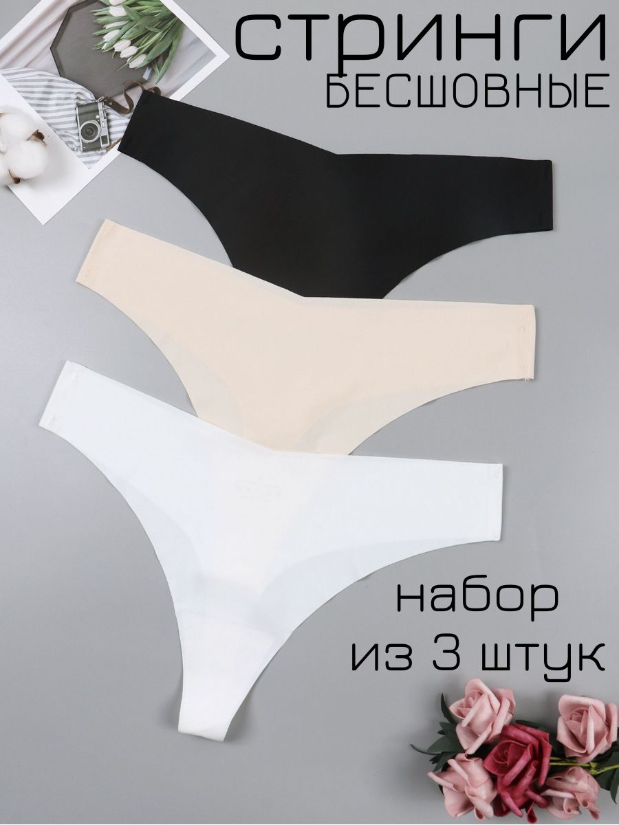 Комплект трусов стринги из 3 шт. - белый, черный, бежевый.. Базовые бесшовные трусы Femme Fashions. Набор подойдет для спорта, танцев, вечерних обтягивающих нарядов или в качестве домашней одежды. Благодаря универсальной посадке сидят идеально на любой фигуре, завышая талию и [...]