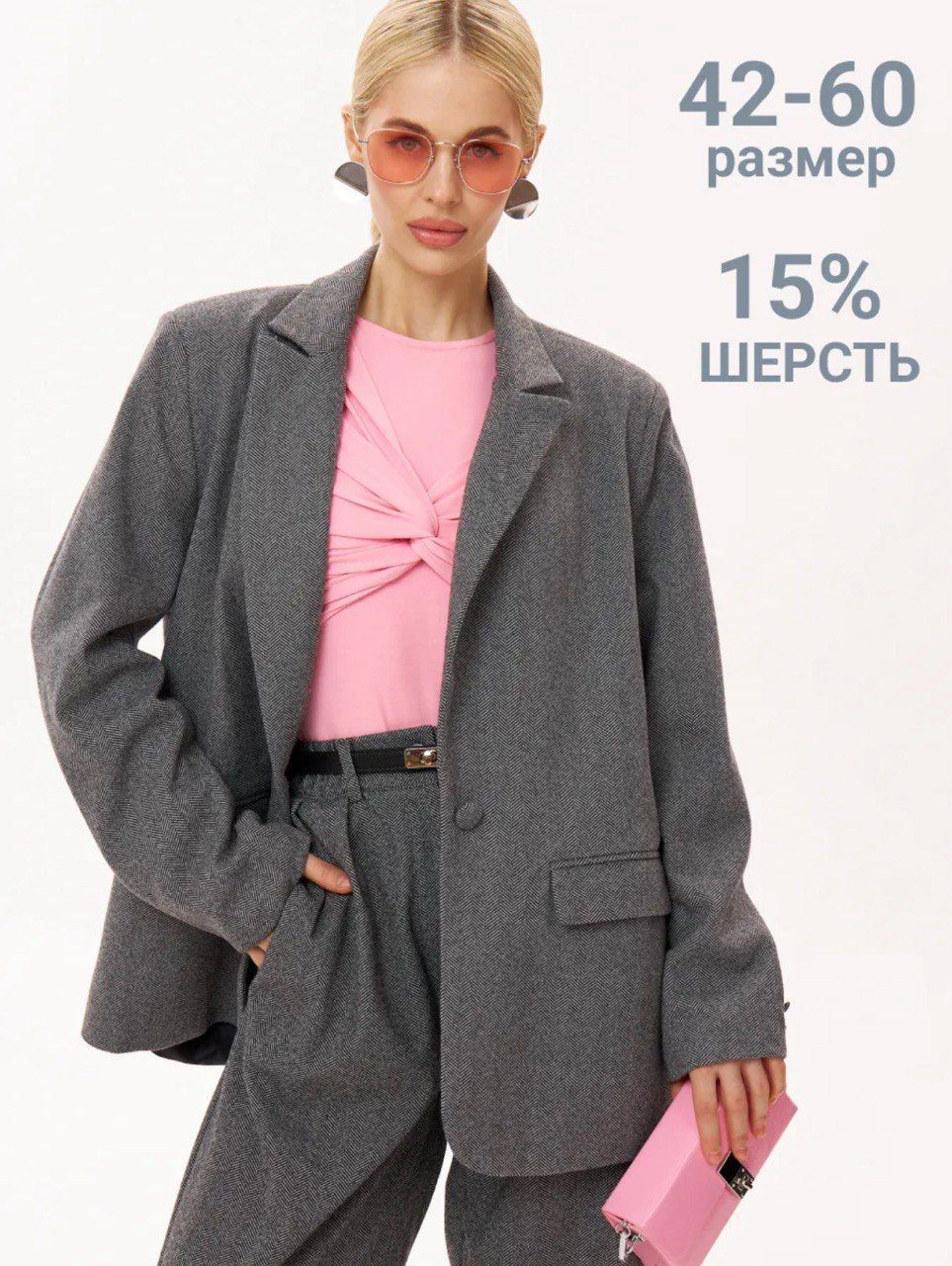 Пиджак женский оверсайз. Выполнен в классическом стиле с английским воротником с лацканами и вставными плечиками, что придает ему официальность. Имеет свободный прямой покрой с удобной посадкой. Изготовлен из ткани высокого качества, в составе присутствует шерсть. Жакет [...]