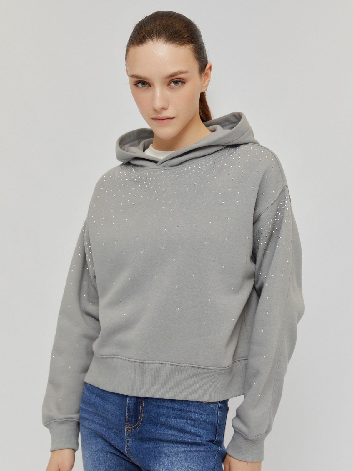 Серый женский худи укороченного фасона из утеплённого трикотажного футера с начёсом внутри, дополненный декором из мерцающих страз, прекрасно подойдёт для стильного и комфортного спортивного образа в прохладную погоду. Модель прямого силуэта со спущенной линей плеча и [...]