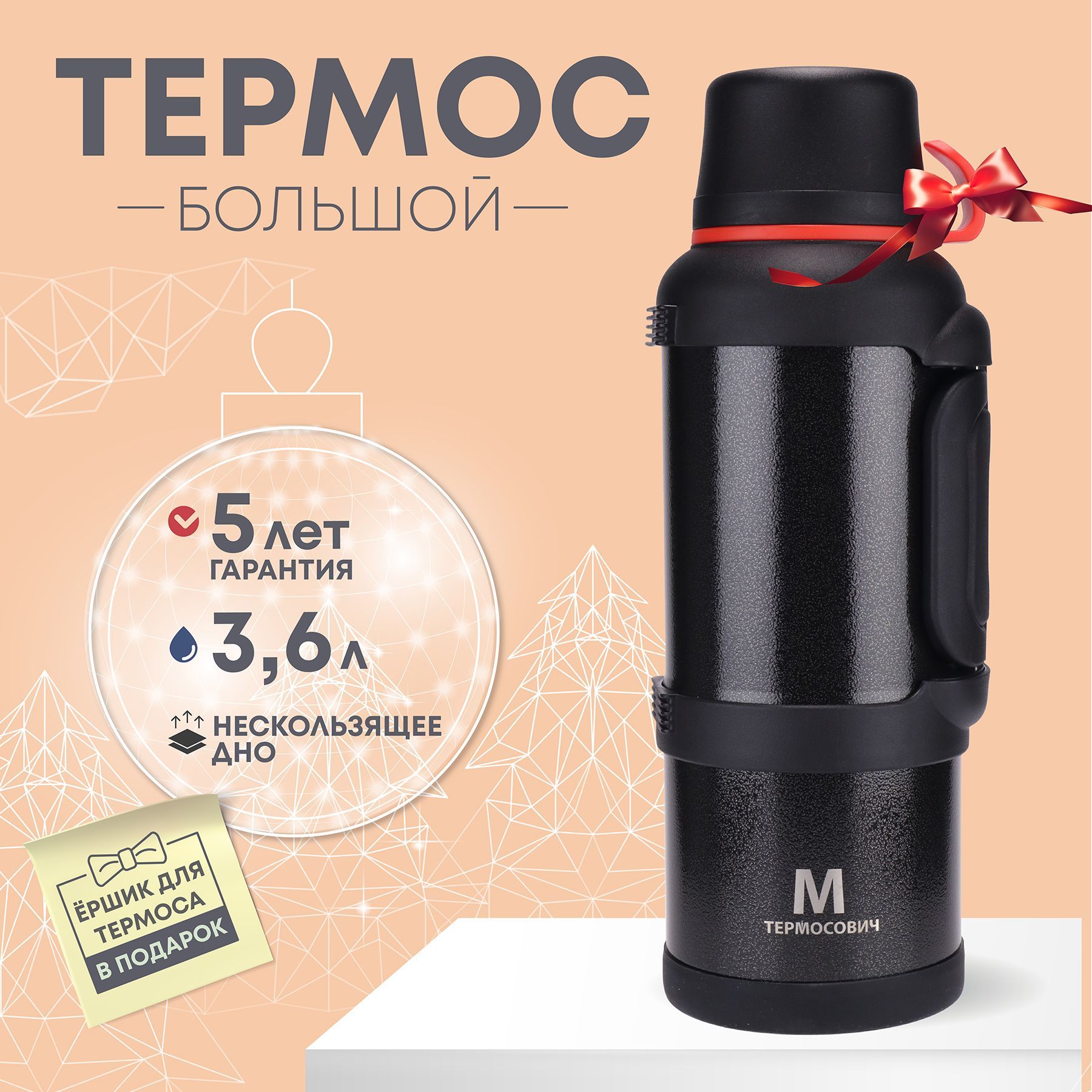 Вакуумный термос серии "MAXI" объёмом 3.6л, черного цвета, Термосович, арт.TRMS104Крышка-кружка с объемом 400мл, пробка-клапан с повышенной теплозащитой “нажал-открыл, нажал-закрыл”, t°8ч=83°С, t°24ч=62°С, дополнительная чашка с ручкой 400мл складная ручка.Термос выполнен из нержавеющей [...]