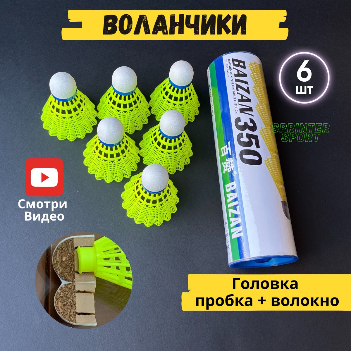Воланы для игры в бадминтон Baizan. В тубе 6 воланов. Цвет воланов желтый.Воланы Baizan для игры в бадминтон модель B-350 состоит из пробковой головки обтянутой ,синтетической кожей, к которой прикреплена пластиковая «юбочка».Данные воланы рекомендуются новичкам и любителям. [...]