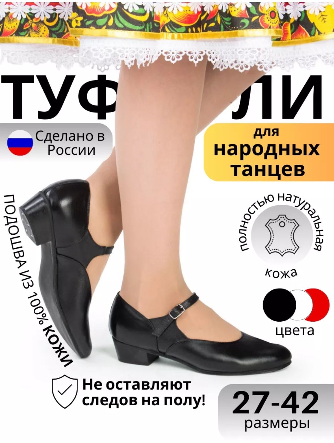 Кожаные женские народные туфли для танцев с ремешком черные. При выборе танцевальной обуви уделите ОСОБОЕ ВНИМАНИЕ подбору размера туфлей для народных танцев. Таблица размеров представлена на последней фотографии. Туфли народные предназначены для занятий танцами. [...]