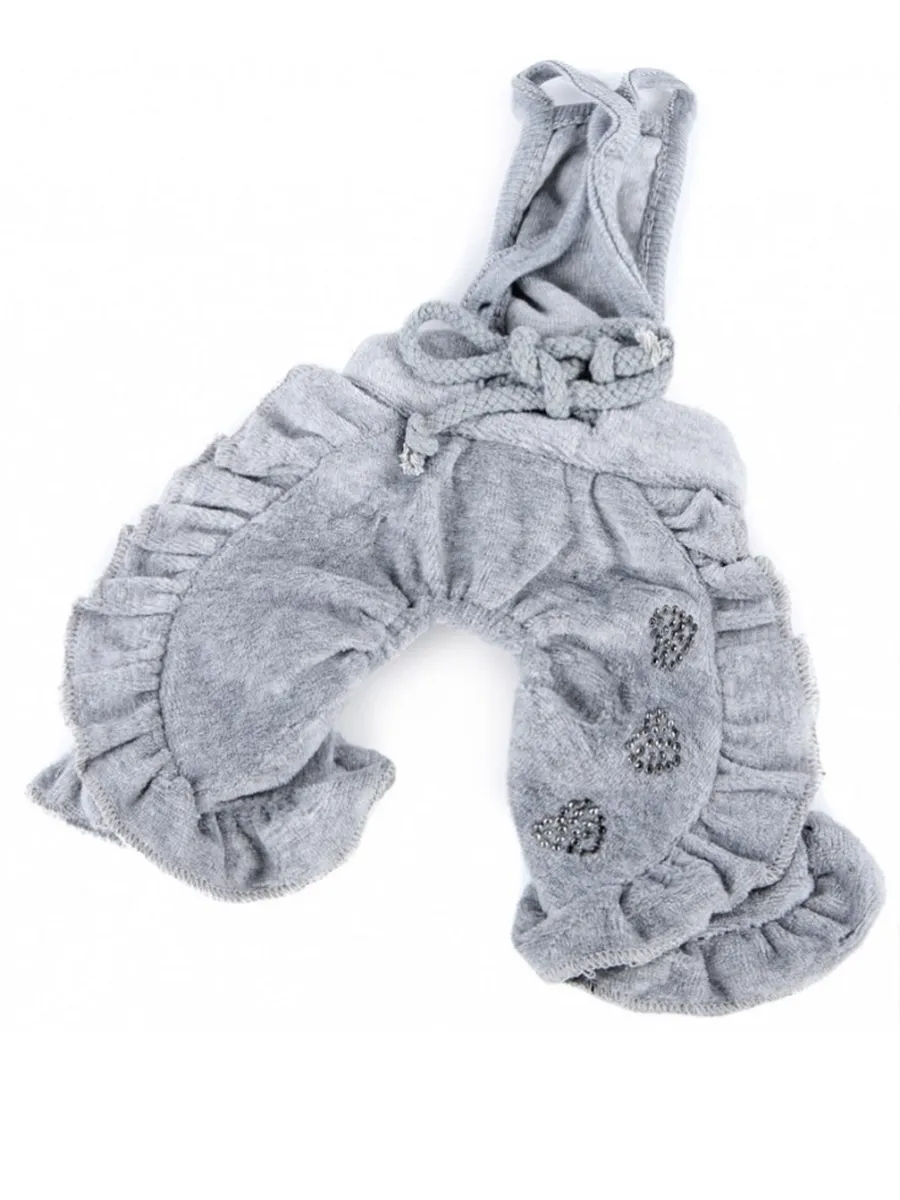 Модные штанишки для Вашей малышки, по диагонали каждой штанины расположен волан по всей длине, так же воланы на окантовках штанин, одна из штанин украшена рисунками из страз в виде сердечек, затягиваются на талии, фиксируются на липучку на животе. Материал: велюр (95% [...]