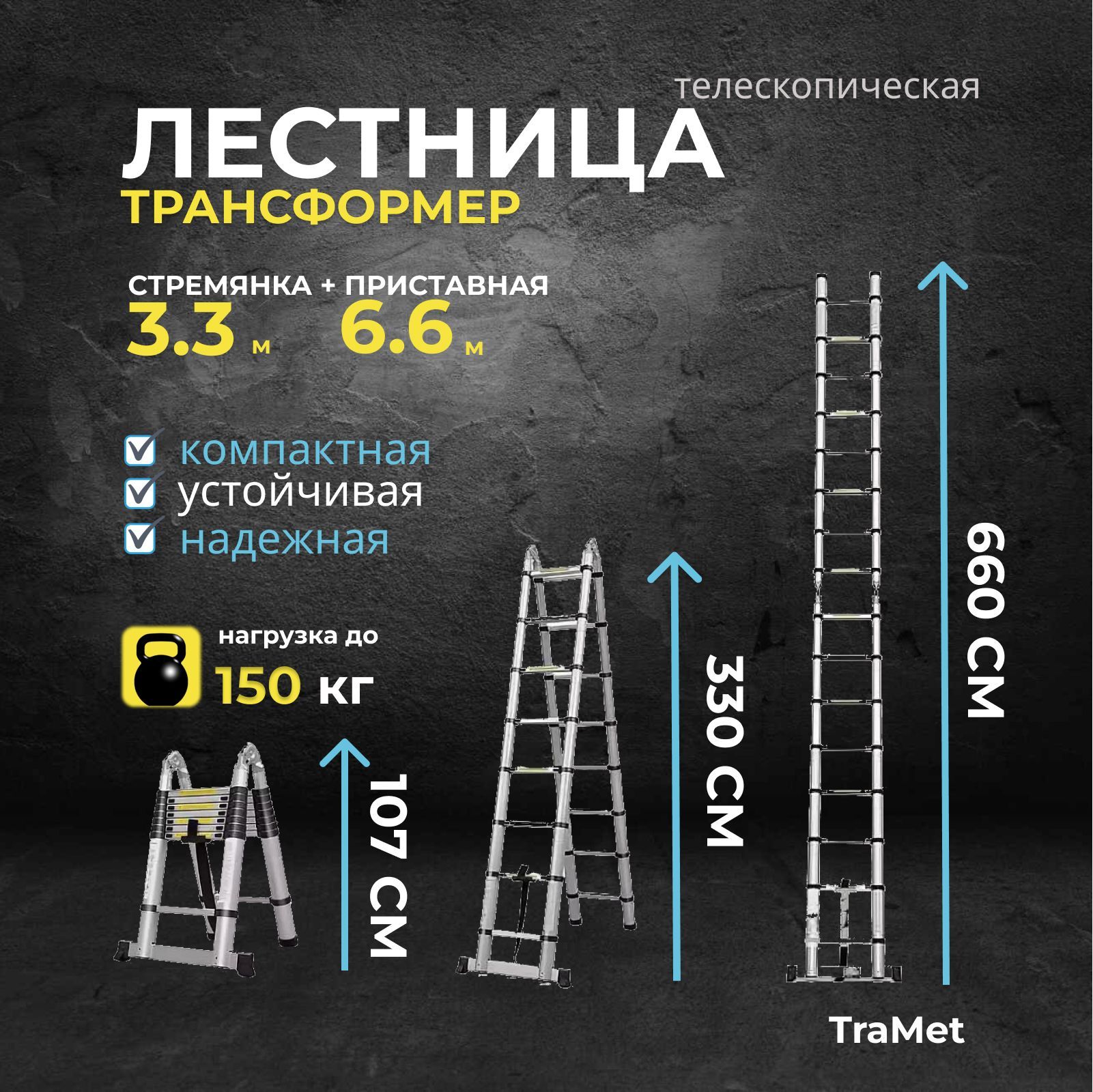 Профессиональная телескопическая лестница TraMet имеет общую длину 6.6 м в виде приставной лестницы и 3.3+3.3 м как стремянка. Изготовлена из алюминия, замки обеспечивают надежную фиксацию лестницы при использовании. Каждая ступенька снабжена фиксирующим элементом. Ступени не [...]