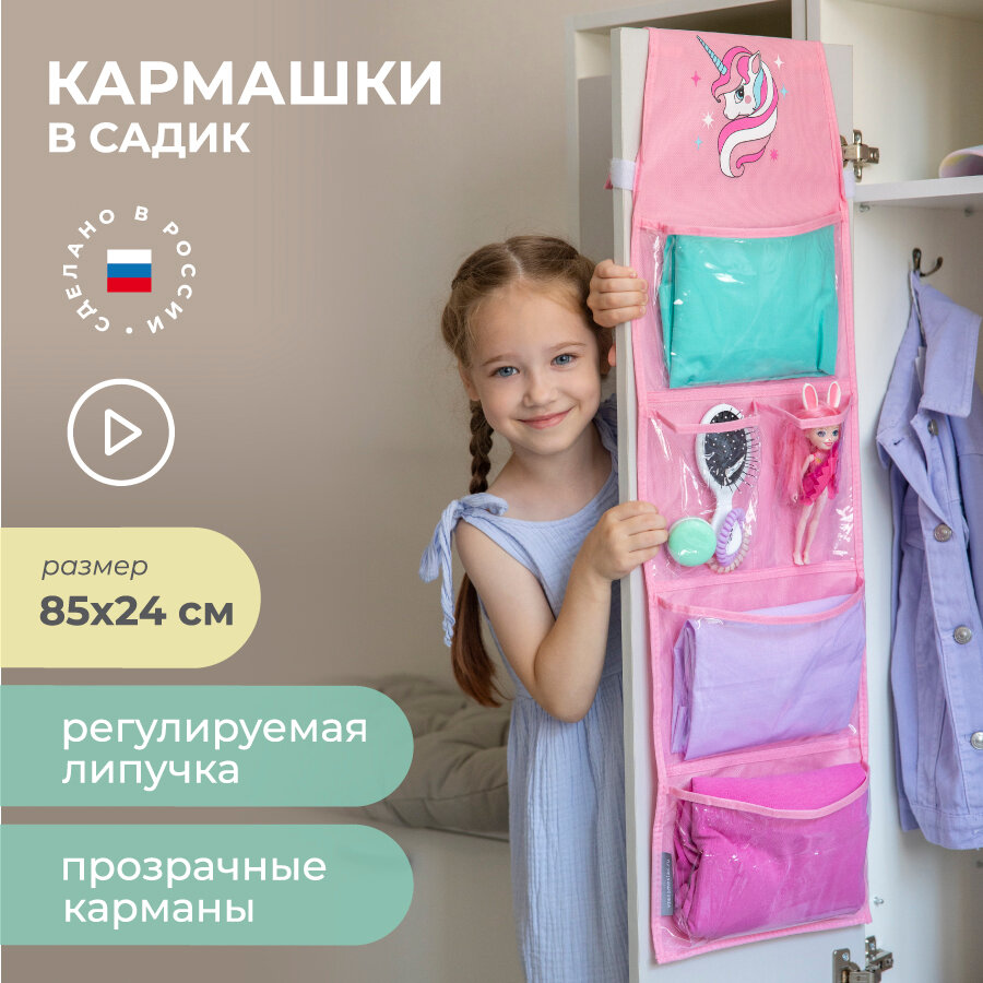 Кармашки В садик для детского шкафчика на липучке 85*24 см, розовые с рисунком 1 шт.<br />Особенности этой модели кармашков:<br />1) 2 варианта крепления - регулируемая липучка и петли для крепления на любую вертикальную поверхность с помощью крючков (крючки в комплект не входят)<br [...]
