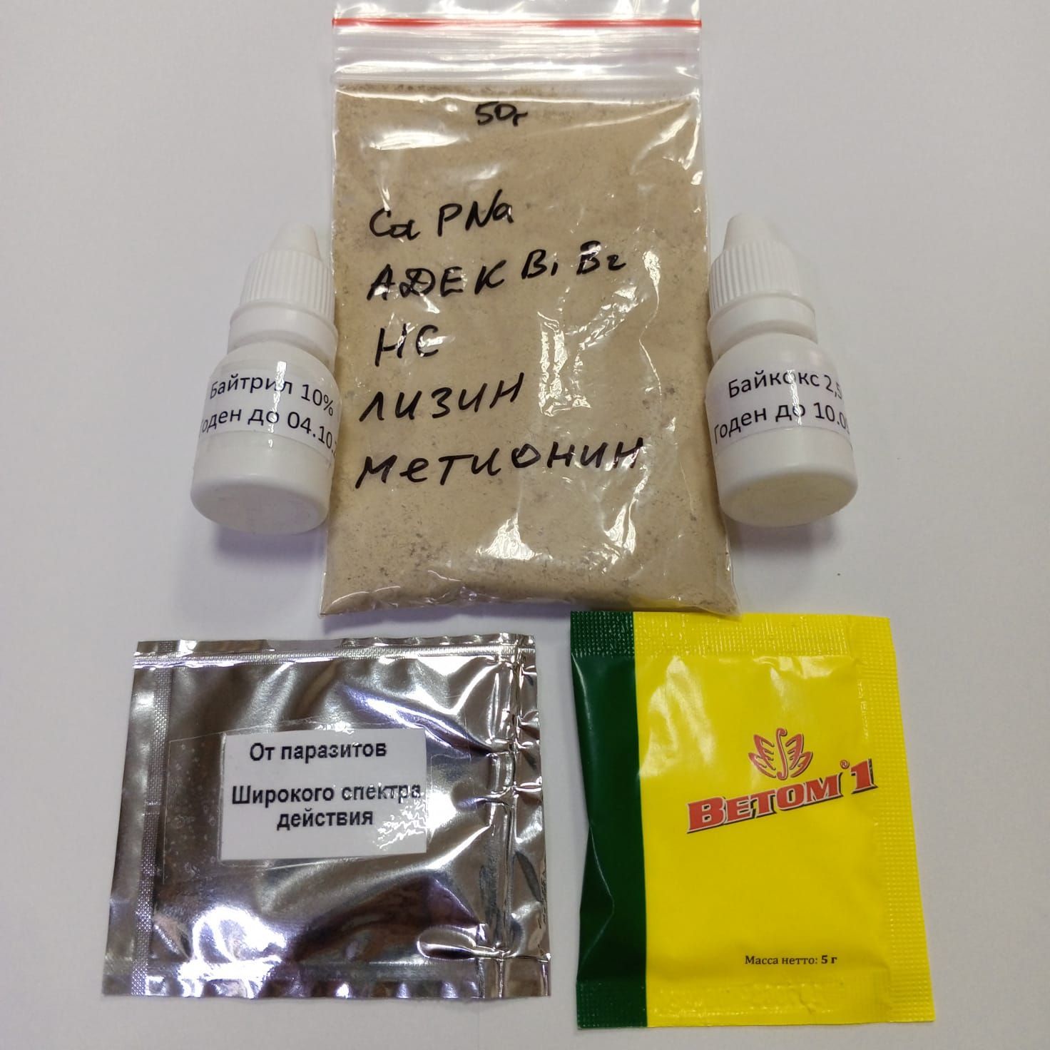 УНИВЕРСАЛЬНЫЙ НАБОР! ДЛЯ ПТИЦ И ЖИВОТНЫХ.Рассчитана на поголовье 15-70 штук. В зависимости от вида и возраста.В составе:1) антибиотик Байтрил 10мл - 1шт2) Витамино-Минеральный комплекс 50гр - 1шт3) кокцидиостатик Байкокс 10мл - 1шт4) От паразитов - 1шт5) пробиотик Ветом1 5гр - 1шт1)Байтрил [...]