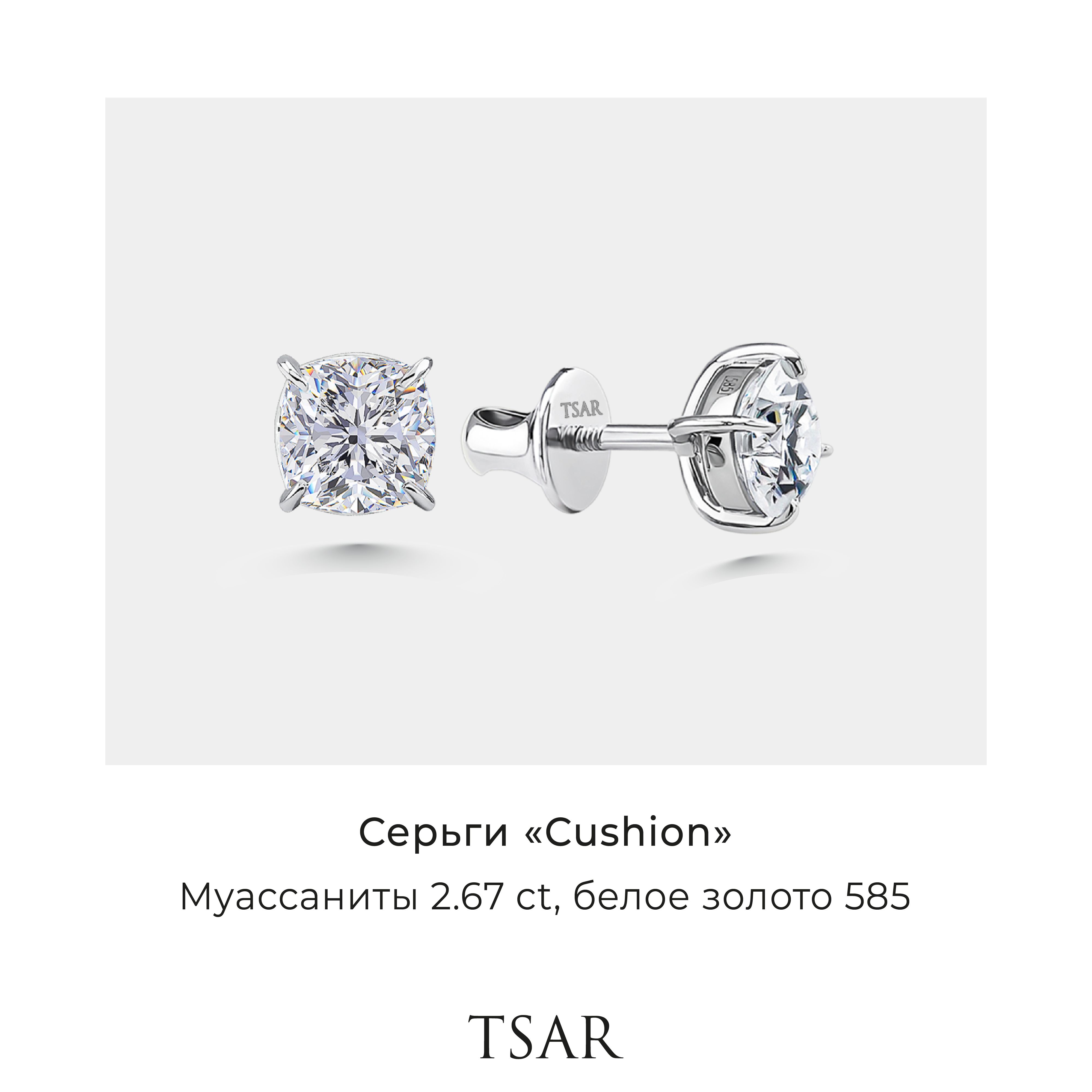 Пусеты Золотые Серьги из белого золота 585 пробы с муассанитами 6*6 мм высших характеристик D/VVS1, весом более 1 карата каждый, стильной бриллиантовой огранки "кушон". Продуманная лучшими мировыми дизайнерами конструкция обеспечивает идеальное сияние камня - открытый снизу [...]
