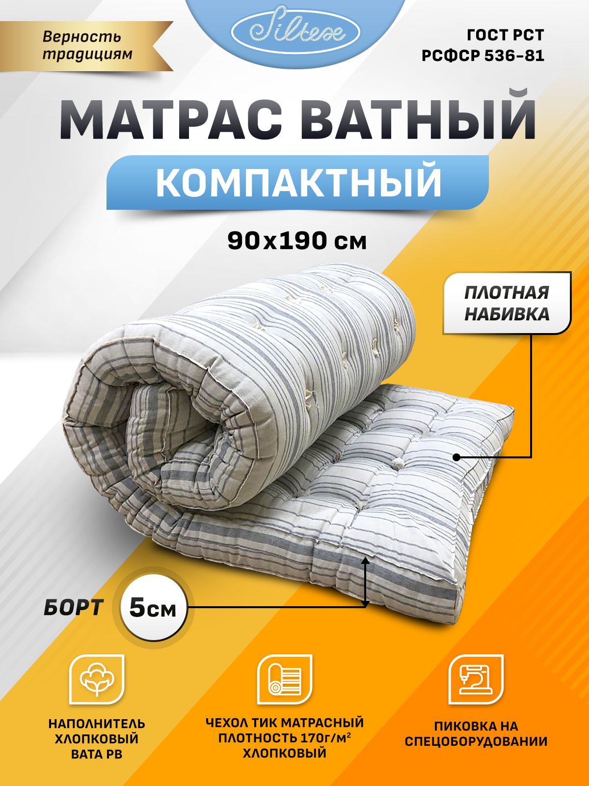 Матрас ватный РВ 140*190, беспружинный. Изготовлен по... [...]