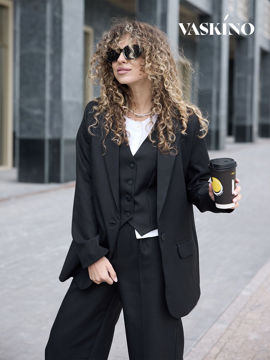 Брючный костюм для офиса с жилетом удачно впишется в деловой стиль. Повседневный однотонный комплект из брюк и распашного жилета, без подклада. Рост модели 165 см. Рекомендация по выбору размера. При выборе размера просим ориентироваться на объемы талии и бедер. Более критическим является размер по талии. Если у Вас промежуточная мерка, то лучше выбрать больший размер. Следует учитывать, что ткань не тянется. Настоятельно рекомендуем перед заказам снять Ваши актуальные мерки по талии и бедрам. Без аксессуаров в комплекте.