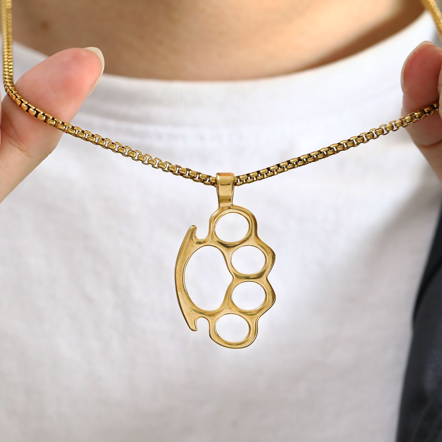 Подвеска с цепочкой из нержавеющей стали в форме кастета – мужская бижутерия на шею для настоящих мужчин. Оригинальный мужской кулон серебро является отличным способом выразить мужественность, смелость и силу. А еще серебряная подвеска мужская на шею – это не только красивое украшение, но и символ стиля и индивидуальности.Материал изделия – нержавеющая ювелирная (она же хирургическая / медицинская) сталь, которая обеспечивает прочность и долговечность. Подвеска мужская серебро идет в комплекте с цепочкой. Длина цепи составляет 60 см, что позволяет носить ее в любых условиях и сочетать с различными стилями одежды. Замок на цепочке – надежный карабин, он не расстегнется и его тяжело сорвать.Подвеска серебро мужская выглядят легкой и молодежной. Бижутерные подвески мужские на шею как интересные и оригинальные аксессуары набирают свой тренд с каждым днем и в 2023 году отличаются своей доступностью.Цепочка с подвеской серебро и надежным замком подходит как для подростков, так и взрослых молодых людей и может послужить как подарочный медальон.Если вы ищете что подарить на новый год, ко дню святого Валентина, 23 февраля в подарок парню на день рождение, любимому мужчине или мужу, а также мальчику подростку или другу, то подвеска кулон на шею мужской может стать отличным выбором. Такое шейное изделие как мужская подвеска кастет может служить как оберег или талисман, который будет защищать своего владельца. А еще красивый и стильный серебряный кулон мужской на шею может стать символом дружбы.Кулоны и подвески на шею – это мужские аксессуары, которые добавляют оригинальность в стиль и образы молодежной моды. Качественная молодежная и модная бижутерия мужская jewelry с нержавеющей цепочкой и замком на карабине – это настоящая находка для создания лучших изысканных образов на каждый день. Мужской кулон кастет имеется в двух вариантах: под серебро и под золото.