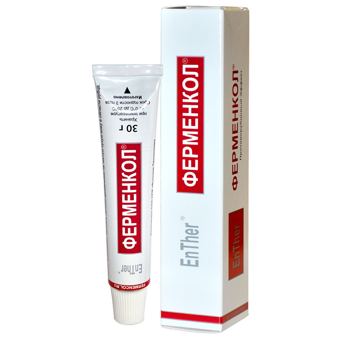 Гель Ферменкол от рубцов, растяжек, постакне и шрамов для ухода за проблемной рубцово-измененной кожей. Ферменкол гель является инновационным ферментным средством, которое оказывает ярко выраженное противорубцовое действие в пораженных местах различного происхождения. Ферменкол гель абсолютно нетоксичен, а его высокая избирательная активность позволяет рассасывать рубцовый коллаген, не затрагивая здоровые ткани. Использование геля для энзимной коррекции позволяет эффективно препятствовать разрастанию рубцовой ткани, убрать болевые ощущения, ощущение стягивания и зуд в зоне рубца, а также размягчить его и уменьшить в размерах за довольно короткий срок. Ферменкол гель широко используется в профилактических целях, препятствующих формированию келоидов, а также для коррекции уже сформировавшихся рубцов. Препарат рекомендуется использовать для лечения рубцовой ткани, возникающей после травм кожи, ожогов, оперативных вмешательств, угревой сыпи и других дерматологических патологий. Ферменкол противопоказано использовать при индивидуальной непереносимости компонентов препарата. При повышенной чувствительности кожи препарат можно использовать, однако на коже может возникнуть небольшое покраснение, которое исчезнет после курса лечения.