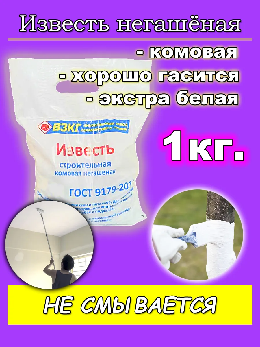 Побелка белая для растений в саду таких как яблоня, для стен и печи, не пачкается. Известь не гашеная комовая с частицами известкого порошка, в виде смеси разных по размеру кусков, используемая для строительных и ремонтных работ, многофункциональное средство в хозяйстве и садоводстве. Смесь для садоводства (подходит для дезинфицирования ферм, ускоряет перегнивание гумуса в огороде, удобрение кислых грунтов, обогащение почв и пр.); Известка для побелки внутри и снаружи помещений, идеальная побелка для потолка белая; После реакции с водой получается - известь гашеная! Можно работать в зимнее время года. Она используется в садоводстве для защиты деревьев так же помогает предотвратить появление мхов, лишайников и других вредителей, а также защищает кору от солнечных ожогов и повышает способность заживления ран, убирает бактерии. Обеспечьте правильные условия для хранения. Помещение, где будет храниться известка для деревьев должно быть сухим, без доступа к влаге. Размещайте мешки с известью на высоте 30 сантиметров над полом; Гасить известь следует в металлических емкостях, на поверхности которых не должно быть ржавчины; Необходимое время для полного гашения – 36 часов. Обязательно используйте средства индивидуальной защиты одежды. При приготовление запрещено вдыхать пары. Применение в качестве защиты для деревьев от ожогов солнца и вредителей, повреждённые участки от инфекций, плохих погодных условий, может частично заменить садовый вар — это специальный состав, который используют для обработки срезов и ран деревьев. Обработка поверхностей раствором извести обладает помощью предотвращении распространения плесени. Однако для полного уничтожения микроорганизмов может потребоваться несколько обработок. Использование в качестве универсального средства от плесени на стенах, путем покраски смотровой ямы, погреба, дезинфекция и уничтожение грибка.